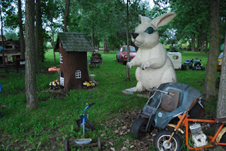 There was a wacky sign, a large baseball player fishing for a giant trout and a big duck with a larger than life elephant in the background but it was about a C+ for our "just try and impress us" attitude. I did get a few cool photos of said fish and duck. There was a storm looming and we decided to step up the tempo and head toward the indoor shop. While heading toward the door, we caught a glimpse of the side yard..... Holy S#@*! Look at all that stuff! There were acres of oddities including junk, sculptures and gargantuan fiberglass creatures.